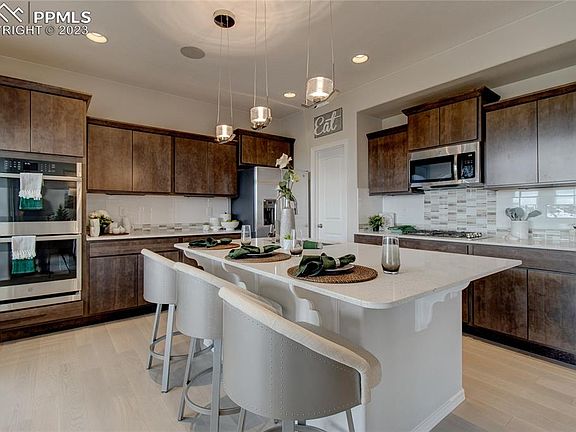 You will love this beautiful new 2 story home under construction located in Banning Lewis Ranch! Lovely two-story Marseille plan with 3 bedrooms, loft, study, 2.5 bath, 3 car tandem garage with full unfinished basement for plenty of room to grow! The great room is full of architectural appeal with stunning raised ceilings and windows for natural light and open gourmet kitchen, dining and great room with gas fireplace. This opens to kitchen featuring upgraded Gourmet kitchen with granite countertops, GE Energy star stainless appliances to include gas cooktop, double wall ovens, microwave above range, dishwasher, designer staggered cabinetry, island with pendant lighting and large walk in pantry. The dining area opens to expanded covered patio for additional entertainment space. Entry boasts high ceilings and overlook from the loft with wrought iron railings. The main level also includes office and powder bath. Master bedroom, loft and 2 bedrooms along with laundry are upstairs for convenience. Master suite includes a 5 pc master bath and large walk in closet. While basement is unfinished for easy future expansion the walls have been raised to 9 ft and the stairs to basement complete this home. The home also includes gorgeous LVP hardwoods throughout, quartz countertops in bathrooms, wrought iron railing at stairs, elongated toilets, and A/C prep package. This home is currently under construction and located in Banning Lewis Ranch community and features amenities such as rec center, pool, splash park, trails, parks, and open spaces! This home was designed for performance and energy efficiency and will receive a HERS score once complete. As a result, you should see savings on your utility bills. Schedule your appointment for viewing today! . PLEASE NOTE: The pictures/Video tour are a model home, same floorplan but unfinished basement, other finishes will vary. Please see sale agent for details.