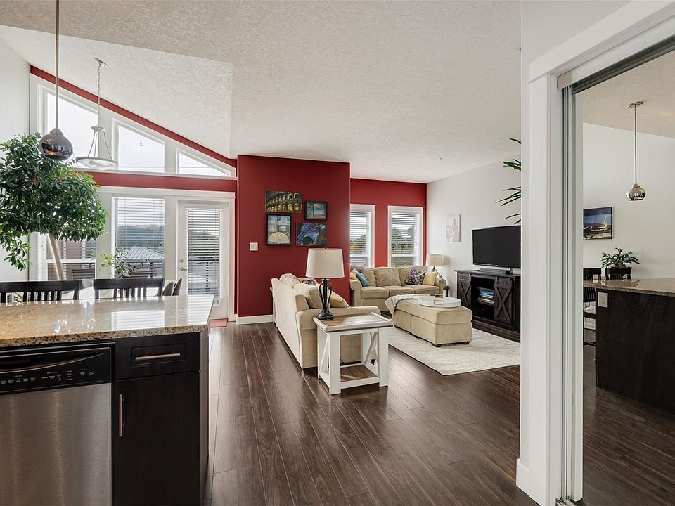 Welcome Home! Bright, spacious top floor, south west, corner unit. You will be greeted by 9-12' vaulted ceiling and full height windows as you enter this open concept living, dining space. Spacious kitchen offering granite countertops including bar seating, tile backsplash & stainless appliances. Featuring large primary bedroom with four piece ensuite and walk-in closet. Additional bedroom is separated by a second 4 piece bathroom offering great privacy. Large 16' balcony to take in the southern views of the hills. In-suite laundry, 2 Pets allowed (no size restriction!) and rentals permitted in the building. Includes a large storage locker and 2 underground parking spaces! Secure visitor parking located underground as well. Convenient access to Langford Lake, Westhills and all of downtown Langford amenities. Easy access to Leigh Road highway entrance. Come see this exceptional value before it is gone.