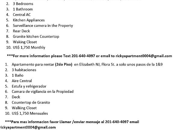 SE HABLA ESPANOL Apartment for Rent (2nd. Floor) in Elizabeth NJ, Flora St. just steps from 1&9. 3 Bedrooms. Walking Closet. 1 Bathroom. Central AC. Kitchen Appliances. Granite Kitchen Countertop. Surveillance camera in the Property. Rear Deck. US$ 1,750 Monthly. Apartamento para rentar (2do Piso) en Elizabeth NJ, Flora St. a solo unos pasos de la 1&9. 3 Habitaciones. Walking Closet. 1 Bano. Aire Central. Refigerador y Estufa. Countertop de Granito. Camara de seguridad en toda la propiedad. Deck en la parte de atras. US$ 1,750 Mensuales. Landlord will run background check on Prior Evictions. Seeking mature minded individuals. Proof of income or pay stubs required. Cats and Small Breed dogs Allow. Tenent Pays for Gas and Electricity