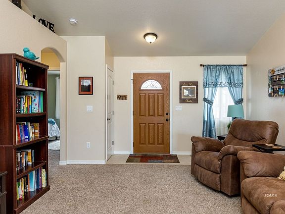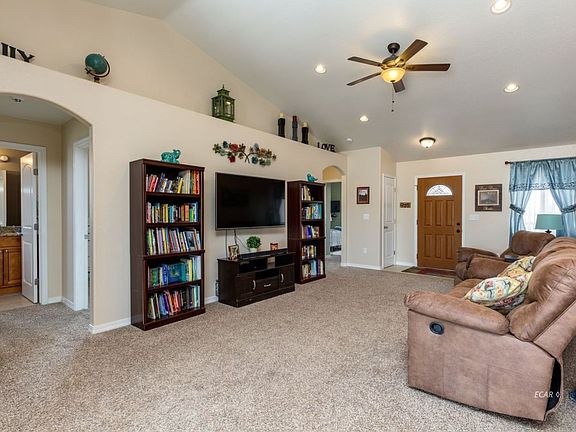 Well taken care of 4 bedroom, 3 bathroom and 2016- SF home. Walk in and see a large living room with vaulted ceilings and tons of canned lighting. The kitchen is very open with a breakfast bar, granite counters, stainless steel appliances and it has a huge lighted pantry. The best part of the kitchen is how much counter space it has and its cabinets space. Right of the kitchen you have a big laundry room with a sink, cabinets and a hanging rack. The master bedroom has trayed ceilings and a barn door to the double closets. The bathroom has double sinks, soaker tub, and a separate toilet with a walk-in shower. The spare bedrooms are set up perfectly in this house. The first guest bedroom has its own bathroom with a walk-in shower and the other two rooms share a bathroom. The piece of property the house sits on is way off the street and has an amazing view. There is fencing around the entire house, a brand new sprinkler system ready for grass. a front patio and fire pit area. The backyard also has an amazing deck thats freshly painted and has a canopy that keeps you cool for summer. The garage is heated, insulated and fully finished offering 709-sf.