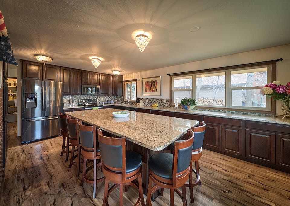 Maintenance free brick/granite home with new roof, Italian tile floors, brick/Travertine wood burning fireplace. Totally remodeled kitchen and bathrooms, master bathroom with walk in tiled shower and dual vanities. Outdoor comfort on 2 lots with 7 zone underground sprinkler system. Great for entertaining with roofed barbecue area on private terrace. New hot water heating system in 2019.