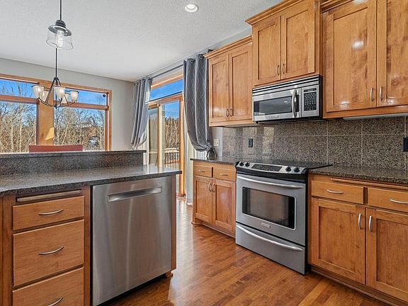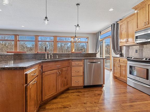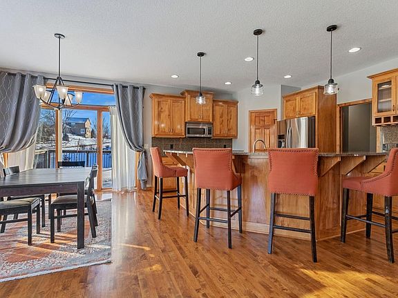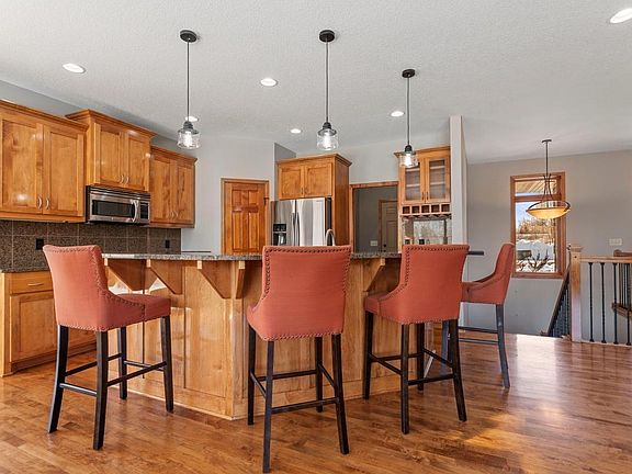 Custom walk-out rambler on quiet cul-de-sac in The Bluffs neighborhood. Home boasts single level living at its finest with primary bedroom, kitchen, dining, laundry, open living space, 3 bathrooms, and one additional bedroom all on the main floor. Two more bedrooms, a living space complete with gas fireplace surrounded by built in maple cabinetry, built in office, bathroom, and bonus room make up the basement. The kitchen and main level living space include maple cabinetry, maple hardwood floors, and built in maple cabinetry surrounding the gas fireplace. The wall-to-wall windows provide ample viewing to the daily wildlife as no homes can be built in front, nor behind the home. Foxes, bunnies, deer, and varieties of birds frequent the location. Enjoy the structure of an HOA for the neighborhood, without the fees, because this home is not assessed HOA dues. Located minutes away from a wildlife preserve, city parks, and downtown Carver shops and restaurants.