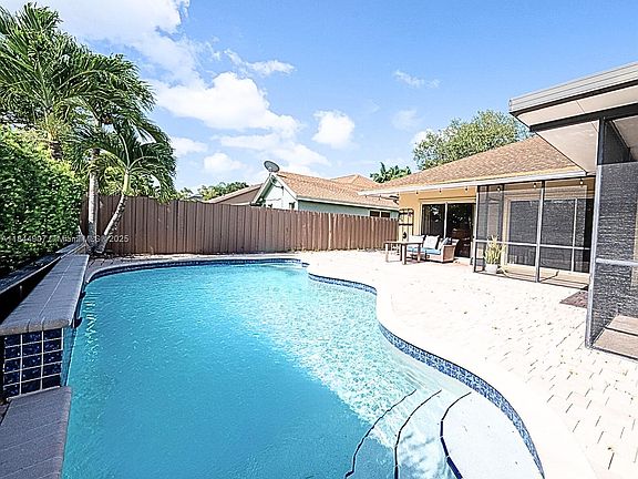 Large, 4/2 pool home on a 8,250 sq ft lot in top-rated school zone. Best price per sq. foot! Vaulted ceilings, all bedrooms located together on one side of the home. Dual zone ACs, large formal living room and formal dining room area. Kitchen is open to family room and dinette area. Two sets of sliding doors lead to covered terrace and screened pool. Master suite features spacious bathroom with separate tub and shower, extra closet, and cabana access. All bedrooms and kitchen and bath are tiled. Double garage has central air, beautiful epoxy floors, thermal barrier padding on its impact electric garage door, side entrance, and closet for AC and timed water heater. No rear neighbor. No HOA approval. Flood Zone X. Includes 1-year American Home Shield Warranty.