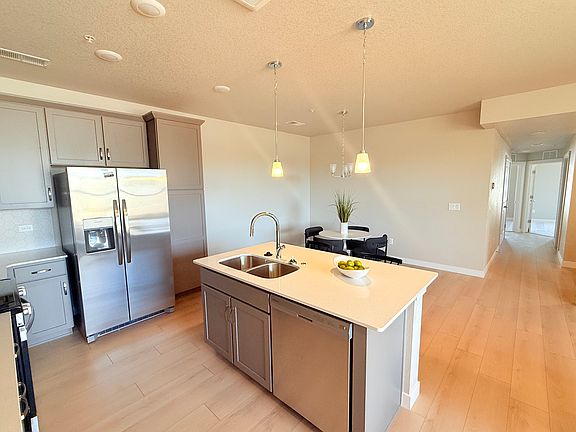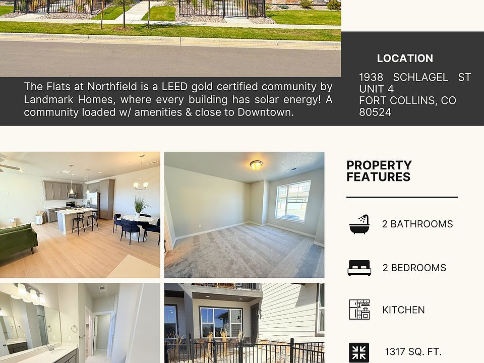 Move in ready! The Flats at Northfield is a LEED gold certified community by Landmark Homes, where every building has solar energy! Nestled in the heart of vibrant Fort Collins & minutes to CSU, the Cascade plan offers a 1 car attached garage, ranch style living w/ no stairs! Bright, open floor plan, dining nook, gorgeous quartz kitchen island, flex space to curl up w/ a good book, oversized primary bedroom, primary bath w/ separate dual vanity, walk-in closet, covered & fenced porch, & large windows allowing an abundance of natural light. Come see the exceptional luxury interior features: high efficiency furnace, tankless water heater, & gorgeous, designer selected "Luxmark" standard finishes, quartz counters, tile surrounds, stainless appliances, tile floors in laundry & bathrooms & 1 car garage included. Enjoy quality craftsmanship & attainability, all located in a community loaded w/ amenities & conveniently located close to downtown Fort Collins, CSU & a future trail to link to the Poudre River Trail system.