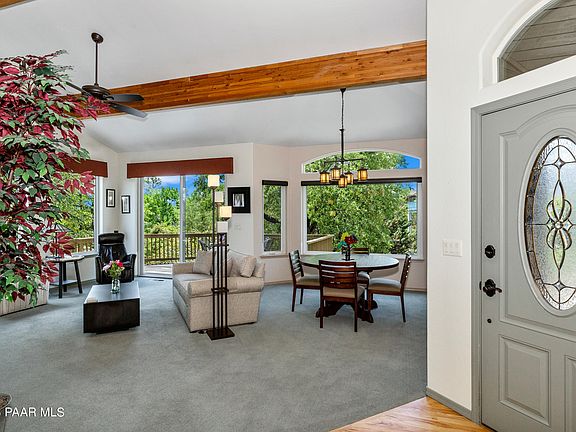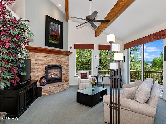 This hidden jewel tucked in the boulders and pines in one of Prescott's most sought-after neighborhoods just got a New Roof! Custom built 3 bed/3 bath home w/office, vaulted ceilings, exposed beams, Anderson windows, stunning stacked stone fireplace. Spacious Trex Deck to enjoy the boulders, trees and distant mountain views. Remodeled kitchen with upgraded granite countertops, knotty alder cabinets, a stunning kitchen island, GE Monogram appliances, pantry and breakfast nook. Office or flex room and half bath complete this level. Then up to the spacious master suite with walk in closet, thoughtfully designed bathroom w/soaking tub & separate shower, two guest bedrooms, Jack & Jill bathroom, laundry room w/ utility sink & cabinets.