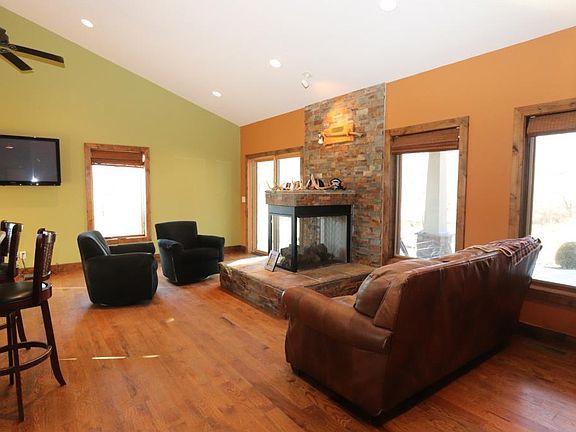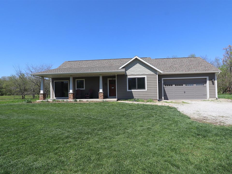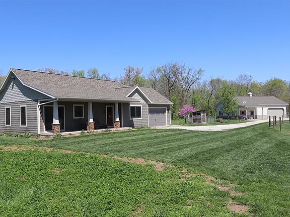 Beautiful home on 9.05 acres with Army Corp ground on the east & west sides of the property. The home was built in 2012 with 1543 sf offering 2 bedrooms, 2 baths, & a full unfinished basement for more living space or storage. The great room has two sliders out to porch and patio for views and relaxing. The Morton building was built in 2008 with a living space of 510 sf offering a bath, kitchen and a garage with 910 sf. Property has 3 fenced acres with a 18x9 run-in shed, a 12x12 metal hay hut, 3 paddocks, and more. Geothermal system with 4 wells for efficient living. A great country property!