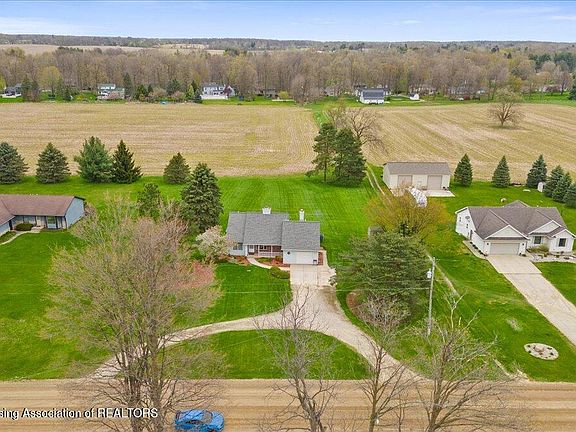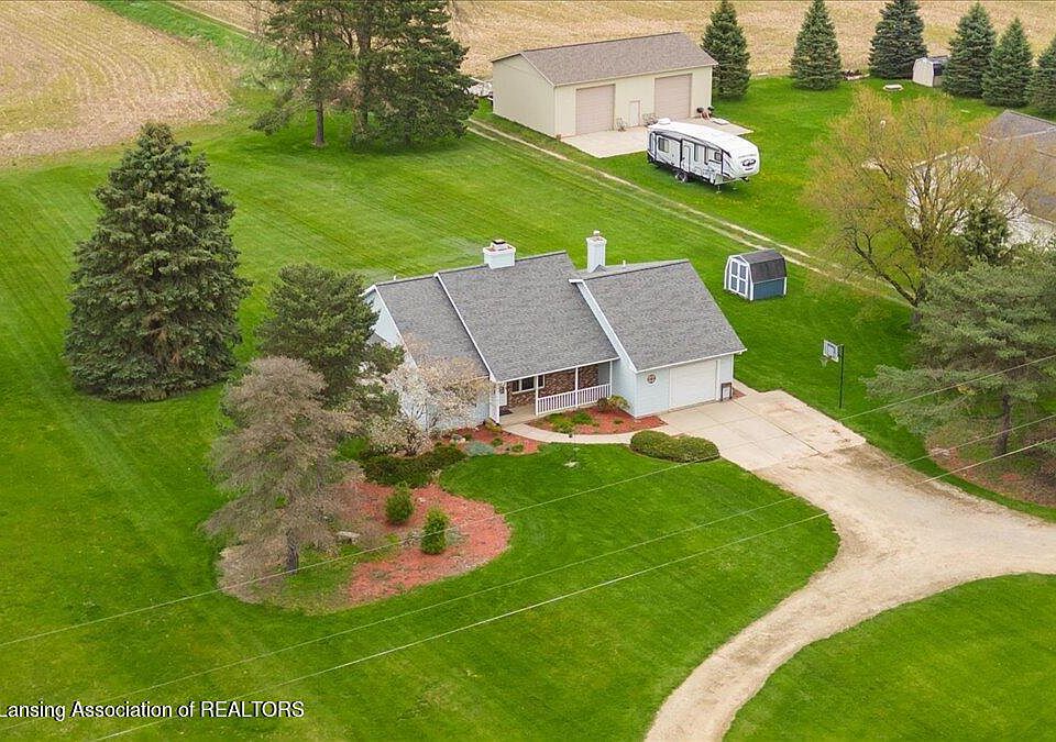 Welcome home to this completely move in ready ranch home located on over an acre of property in the Grand Ledge School District! This ranch home has a great open floor plan with a double sided stone fireplace centered in the middle as a beautiful focal point. The kitchen is spacious with lots of cabinet space and an eat in dining area. The living room features cathedral ceilings and great views of the private and large back yard. The desirable split floor plan has the spacious primary bedroom on one side of the house with its own private access outside to the deck. There is also an attached ensuite bath. There are two additional bedrooms on the other side of the home that share a full bathroom. The lower level has so much storage space and perfect for future additional living space. The outside is very quiet and surrounded by farm fields so you feel like you are on a much larger lot. Imagine sipping lemonade from the covered front porch! The home has been very well maintained, and is completely move in ready! Call for your personal tour today!