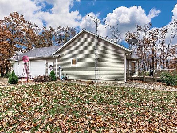 Tucked away on a secluded lot of nearly 13acres and you'll find this custom built, 3 bedroom, 3 bath home with large 15x30ft composite deck for entertaining.The foyer welcomes you into the large living room with cathedral ceilings. The large kitchen with glass tile backsplash and large corner pantry opens up to the living and dining areas. The open split floor plan appoints the Master opposite the secondary bedrooms and full bath, and boasts an ensuite and large walk-in closet. Main floor laundry. Downstairs is an entertainers dream, with over 1100 of finished living space, featuring 9ft ceilings, recessed lighting, custom 18x12ft bar area with cabinetry, and a large half bath. Expand sleeping rooms in the massive 31x14ft area currently used for storage. Home also features a bonus 13x3ft safe room. 2-car side entry oversize garage, additional detached garage and workbench. Prime hunting and recreational acreage with small creek at back end of property. All appliances stay!