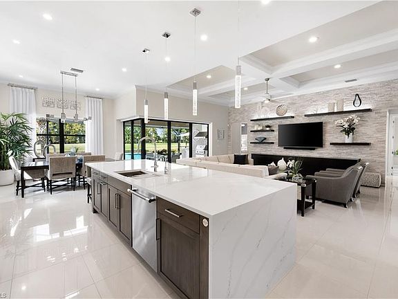 Waterfall islandHeated saltwater poolOutdoor kitchenExpansive lanaiQuartz countertopsCustom wood accentsStacked stone feature wall