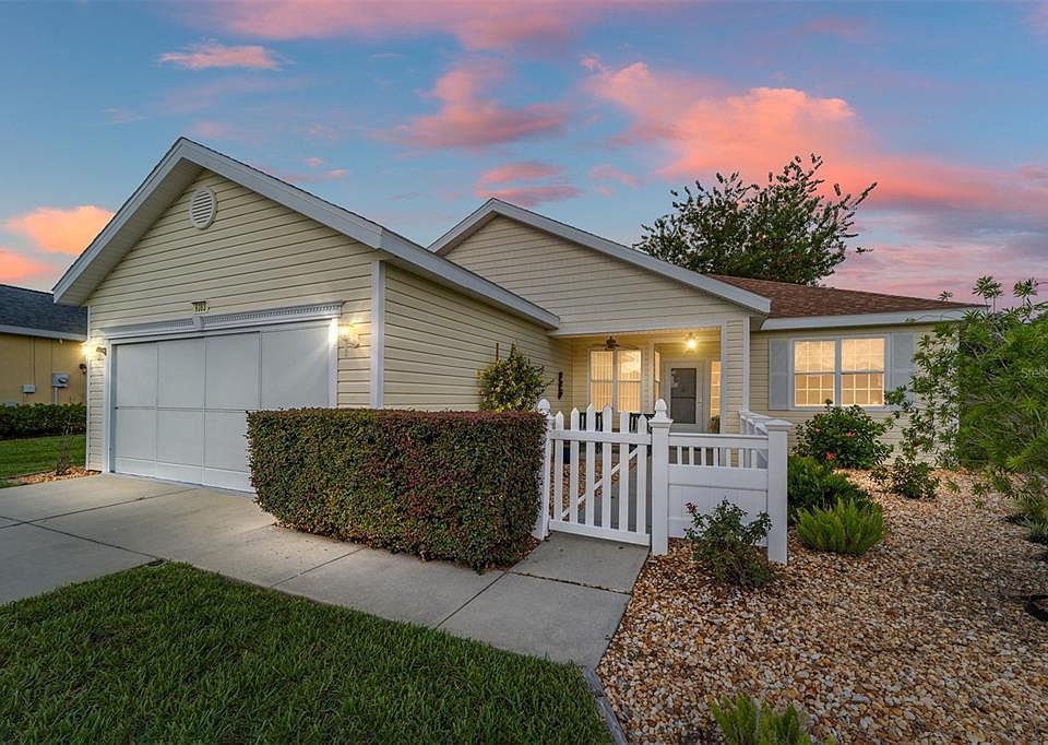Welcome to your new home! This charming 2-bedroom, 2-bathroom Cape Sable model home is located in Del Webb's Spruce Creek Golf and Country Club. The interior of this home is adorned with impressive and desirable features such as: 11-foot high ceilings, QUARTZ countertops in the kitchen, modern light fixtures, ceramic tile throughout the home, and laminate wood in both bedrooms. Regarding the home's exterior, it has a 2021 NEW ROOF, a newly replaced water heater, a spacious lanai with a covered bird cage, a privacy-screened garage, and a newly fenced backyard. This residence offers an abundance of luxurious features, resort- style amenities, and an unparalleled lifestyle. Some of the amenities in this community include 36 HOLES OF GOLF and three recreational areas. The first is The Horizon Center, which is a 32,000 sq ft community center with a multi-purpose ballroom, community kitchen, craft room, meeting rooms, billiards & game rooms. Adjacent is the "Eagle Ridge Golf Pro Shop", The Liberty Grill Restaurant, a heated outdoor pool and spa with a covered lanai, 5 bocce ball courts & eight shuffleboard courts. Second is the lake vista recreation area which is a fitness center with an indoor lap pool, state-of-the-art weight training & cardiovascular equipment. While enjoying a fun workout you are able to take advantage of the lake view (Lake Vista).In the complex you are able to enjoy a large pavilion, horseshoe pits, a gazebo, a walking trail through The American Kestrel Preserve, the Veterans Memorial & a softball diamond.Third in PENINSULA PARK you'll find volleyball court, seven lighted tennis courts, twelve pickle ball courts (lighted) & another large heated outdoor pool/spa (this community offers three pools).This is a highly active community that offers multiple daily activities. In addition this home is conveniently located next to the HCA FLORIDA hospital which is open 24 hrs.This home is close to The Villages, excellent restaurants, and multiple shopping plaza's. The seller is willing to negotiate personal property with a full asking price offer. Schedule a personal tour with me! This home will not last.