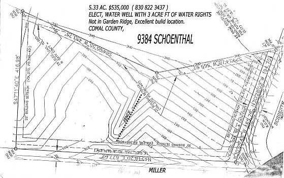 5.33 ac.- 9384 Schoenthal loop comal county tx- Corner lot off fm 3009. & Schoenthal loop and Miller rd. next door to FUTURE SAC and PAC and across from George Ranch.- Electric. Phone and Water on site.- High traffic area great visibility. Outside of Garden Ridge city limits 3 miles from I-35. $535,000