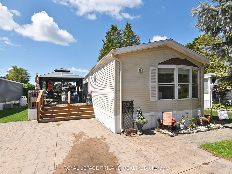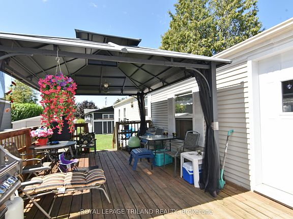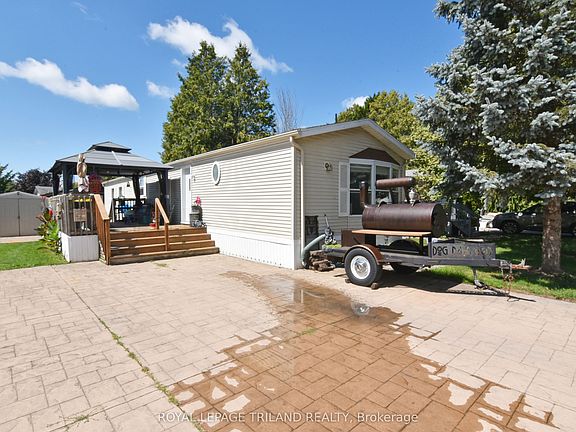 FOUR SEASON - 3 Bedroom / 2 Bath Mobile Home in Woodhaven Resort. Near Ipperwash Beach. Open concept kitchen / dining / living room with vaulted ceiling, laminate floors and propane gas fireplace. Large kitchen has plenty of cupboards and counter space, lots of windows and a Reverse Osmosis water filtration system. Primary bedroom includes 3 piece ensuite with shower and walk in closet. The second & third bedrooms are at the other end of the unit near the 4 piece bathroom with tub/shower. Separate laundry room/mudroom area. Propane furnace & central air. Large wooden deck with gazebo. Shed stays. Stamped concrete driveway. Land lease is $575/month (to be confirmed). Park amenities include inground pool, playground and laundry facilities. Only 50 minutes to London, 40 minutes to Sarnia, 20 minutes to Grand Bend.