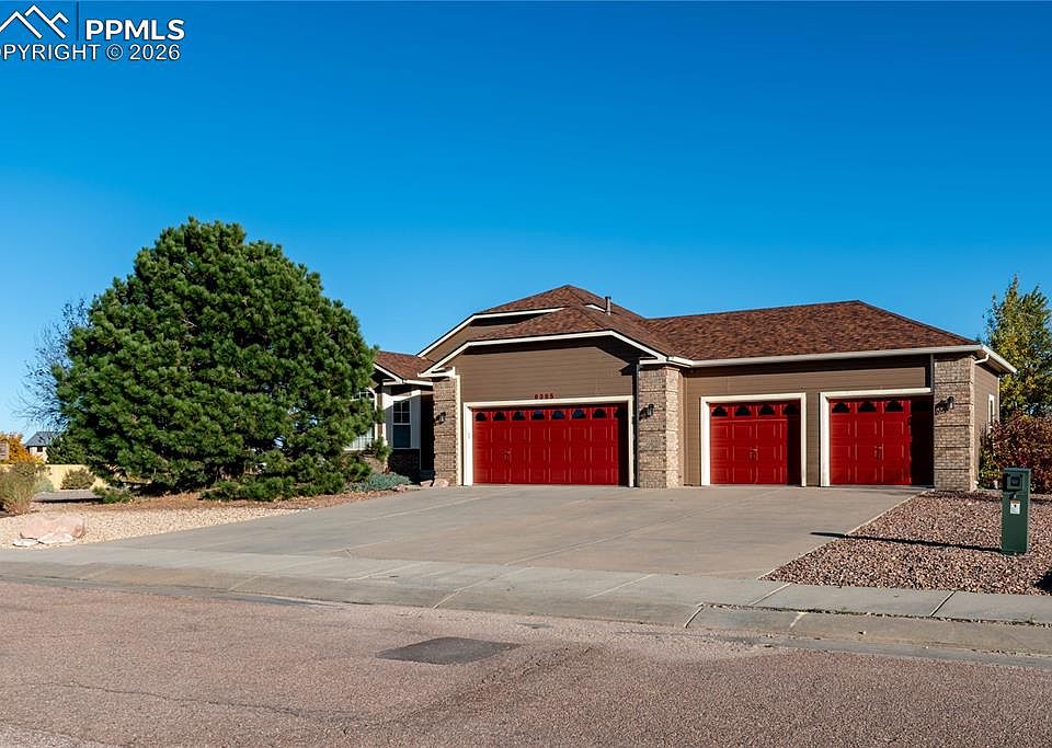 Refined luxury meets effortless main-level living in this former builder’s model, ideally positioned on the 3rd hole of Antler Creek Golf Course. Backing directly to the fairway, this walkout ranch offers privacy, sweeping views, and timeless craftsmanship on a fenced, professionally landscaped 2/3-acre corner lot with front and rear drip irrigation, and an oversized 4-car garage. The home has been meticulously maintained and upgraded with a Class 4 impact-resistant roof (2021) with a transferable warranty, new gutters, and a full exterior repaint in 2021 using premium 10-year Sherwin-Williams paint. The main level features hickory hardwood flooring and an open, light-filled layout designed for daily comfort and entertaining. The chef’s kitchen offers solid-surface countertops, pull-out cabinetry, a custom dining island, tile flooring, and newer stainless-steel appliances, including the refrigerator and dishwasher. Living and dining spaces open to an upgraded deck with enhanced handrails and stairs, and unobstructed golf course views. Comfort is enhanced by a whole-home sound system and an AprilAire whole-house humidifier. The primary suite is a private retreat with a five-piece bath, a jetted soaking tub, an oversized shower, a private commode room, and a walk-in closet. Two additional main-level bedrooms share a Jack-and-Jill bath, with a nearby laundry room and powder bath. The walkout lower level offers a spacious entertainment area with built-ins and surround sound, two large bedrooms with double closets, a full bath, and access to a custom patio overlooking the golf course. Additional features include central air, central vacuum, and a security system, as well as proximity to a fire station, an El Paso County Sheriff substation, community pools, recreation centers, walking trails, and the High Plains branch library.