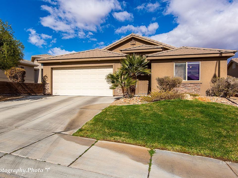 This Ence constructed home is located in Shadow Hawk, a desirable community north of I-15. This well maintained development is centrally located and within close proximity to golf courses, restaurants and casinos. The quality of construction is superb and the home's energy efficiency is a bonus. The backyard is surrounded by a privacy wall and the partial mountain view to the east is beautiful The home is bright with numerous windows and vaulted ceilings. The floor plan has an open concept and the paint tones are neutral. The kitchen is attractive with custom cabinets, granite counter tops and stainless steel appliances. The raised bar allows ample room for bar stools and gatherings. The home has tile floors through the traffic areas and carpet in the great room and bedrooms. The minimal monthly HOA fee includes front yard landscaping.