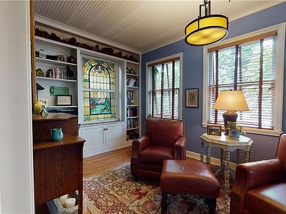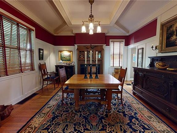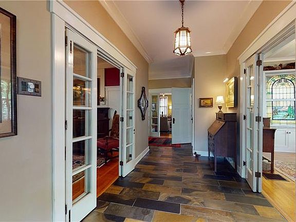 Spectacular Regent Square Home. Numerous customizations and updates throughout. Slate entry with crown molding. Bifold glass doors separate entry from living room, dining room and family room creating a very open and airy setting. Brass hardware on doors. Living room features built-in bookcases. Hardwood floor borders. Dining room with beamed ceiling, wainscotting on the walls, decorative fireplace with wood mantle with cabinet. Family room with beamed ceiling, wood burning fireplace and is open to the kitchen. Kitchen features stainless appliances, custom Mission cabinetry, solid walnut countertops, and built-in shelving. Master bedroom with hardwood floors, built in book cases and desk. 2nd floor bath features marble, double sink basins, and wainscoting. Additional rooms on 3rd are unheated. Game room in basement along with laundry area and 2nd full bath. Outside living space-covered front porch and fabulous rear patio area. Beautiful plantings and landscaping.