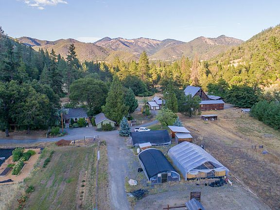 Looking for that perfect property that has it all. Well here it is. This sprawling EFU property has 2 nice single family homes, a large pole barn, several workshops and outbuildings, a milking barn, 3 farm hand mini homes, several hoop houses, water rights to Thompson Creek that runs through the property, 2 man made reservoirs used to irrigate the upper fields, hiking and riding trails throughout the property that is backed to BLM. The original home is a beautifully updated 2/1 mid century farmhouse with detached 2 car garage + outside office. This home has been nicely updated with porcelain tile, hardwood floors, spacious kitchen with stainless steel appliances, granite counters and a large breakfast bar. The 2nd home is a newly finished custom 2/2 straw bale home with cherry floors and vaulted ceilings. This home has a very energy efficient soap stone stove and spacious layout. There are just too many features to list.