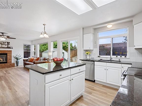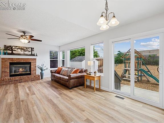 D20 Summerfield home just a short walk to Academy International Elementary! Relax on the covered front porch overlooking a low-maintenance xeriscaped yard. This home is updated with modern colors, 2025 LVP flooring throughout the main level, and contemporary finishes. Exterior showcases white-painted brick and a bold red door, creating a clean, minimalist aesthetic. Inside, the open living and dining areas are filled with natural light. The kitchen flows seamlessly into the cozy family room and features white painted cabinets, black granite counters, white tile backsplash, stainless steel double oven, oversized pantry, center island, and a perfectly placed sink with views of the backyard. Step outside to a fully fenced, private backyard with flagstone pavers, oversized shed, mature garden beds, and a majestic tree perfect for swings. Rear gate offers access to the elementary school, grocery store & frozen yogurt shop. The inviting family room features a brick fireplace with a white mantel, modern ceiling fan, and wall of windows that fills the space with natural light. Upstairs, the spacious primary suite boasts vaulted ceilings, 5 piece bath with dual vanity, mountain views, and a walk-in closet. Three additional bedrooms, full bath, and oversized laundry room with shelving complete this level. A large stairwell window captures beautiful Colorado mountain views. Finished basement includes a generous rec room, 5th bedroom, and ¾ bath—perfect for guests. Recent upgrades include RetroFoam insulation: quiet and energy-efficient, 2024 Class 4 roof, 2025 interior paint, floors, and fixtures, 2023 exterior paint, 2020 furnace with humidifier, 2014 A/C, and insulated garage door with brand new opener. Ample linen & basement storage. Prime location near Children’s Hospital, Shops at the Promenade, Library 21C, and John Venezia Park with pickleball courts, splash pad, and soccer fields. Minutes from the Air Force Academy with easy I-25 access. No HOA. This one is a must-see!