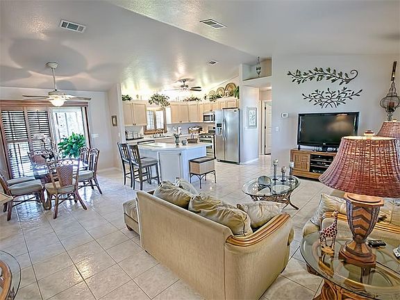 A Place to Call Home! Spectacular golf course view and a sparkling, charming Chestnut II model with split plan bedrooms. Both bedrooms are king-sized with walk-in closets! Open in design, vaulted ceilings, stainless appliances (2014), gas stove, no carpet in home! Plantation shutters throughout, shared well to save on irrigation water. Exterior recently painted (Constantino), electric retractable garage screen. Enjoy the 10x15 enclosed lanai and forever a breathtaking view of golf course and water. Conveniently located close to community pool, recreation center, golf course and restaurant! A Real Gem! Furniture available separately.
