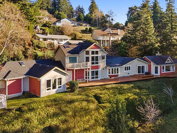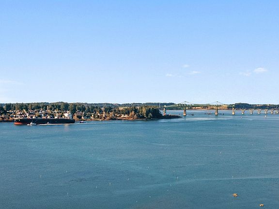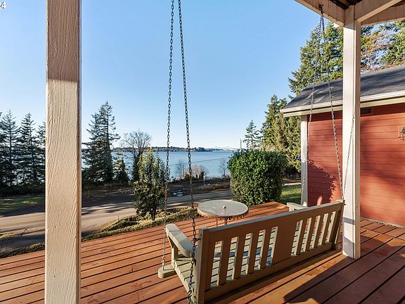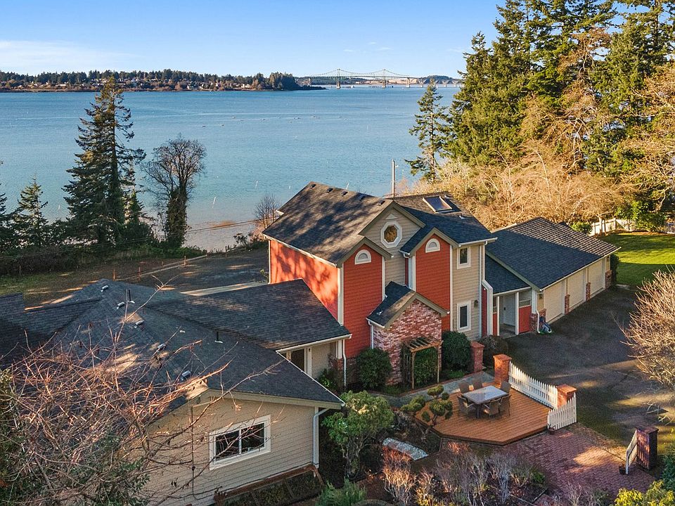Gorgeous Water Views with a backdrop of the McCullough Bridge and city lights. Meticulously maintained custom-built home on .71 acres with custom oak carpentry built-ins and floors. Tall High-end Windows and a methodical layout showcase Breathtaking Bay Views throughout the entire home. Inside you will find 3 fireplaces, an expansive great room, a living room with coffered ceilings and a bar, plus a gourmet kitchen built for the culinary enthusiast. The Highlights of the master suite include a private balcony overlooking the trees and water, a hidden walk-in closet, and a Spa like washroom with heated floors. Outside boast multiple decks with access points throughout the home, a 3-car garage with a 180 sqft finished studio, beautiful landscaping, and panoramic Water Views. The local area is famous for its World-Class Salmon Fishing and Oregon Recreational Sand Dunes. All the finishes in this home have been well crafted. You must see this home to appreciate its clever architecture. Tranquility and comfort await in the properties harmonious blend of elegance, comfort, functionality, and warmth.