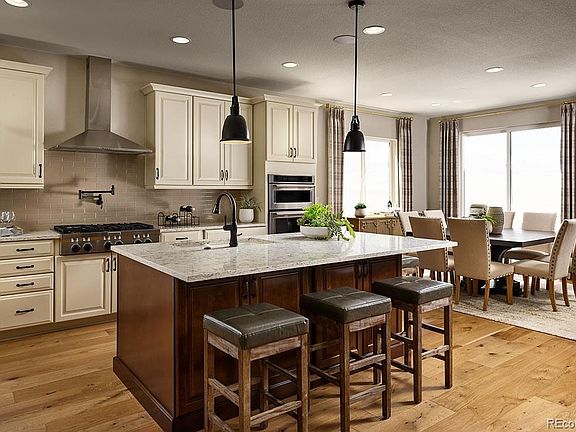BUILDER'S MODEL HOME FOR SALE! Check out the 3D virtual tour! Luxurious ranch style home with modern architecture. Open great room and kitchen with stylish white cabinetry and brown furniture style island. Pro kitchen with KtchenAid stainless steel appliances, quartz counters, pot filler and under-mount sink. Additional features include wide plank engineered hardwood floors, open wood railing to the finished basement, convenient laundry room off the master with sink and a main level open study. The exterior features prof. landscaped front & backyard landscaping. As if that wasn't enough, the finished bsmt includes an additional bedroom, bathroom, rec room and wet bar with sink and dishwasher. Draperies, art, built-ins & mounted tv's are included but be sure to inquire about the ability to purchase all the furniture for a truly 'move-in ready' experience. Home is sold as is. Located in the desirable Candelas community, new K-8 school, two rec centers with outdoor pools, exercise rooms, party rooms. A network of trails, parks & tennis courts.