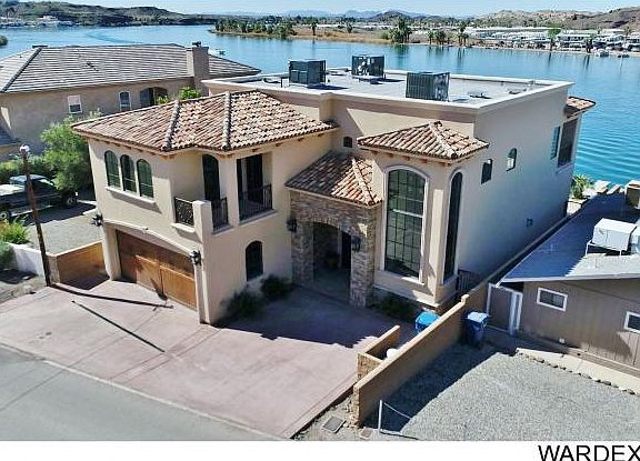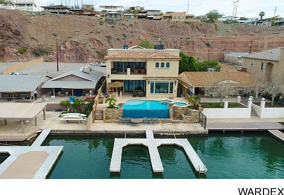 BRAND NEW Riverfront Home on the Parker Strip! Step In...you will not want to leave! Seller is a CA Contractor who built this for their own Private Paradise at the River! From Travertine Floors, Interior Hardwood Doors, JeldWen windows, triple ogee finish granite counters, Sub-Zero, Viking Range- with the elevated Spa cascading into the Riverfront Infinity Pool that appears to flow into the River-- NO detail was missed! The Master Bedroom and Balcony overlooking Pool and River will seal it for you. Room for Four Boats on the Docks! Toy Barn with guest apartment across street also for sale separately. COME SEE IT TODAY!!