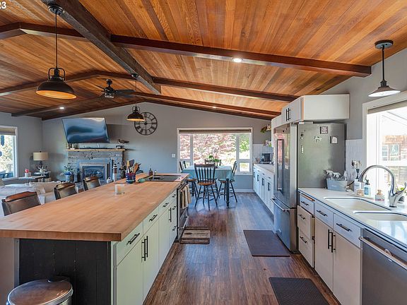 Experience BREATHTAKING views of the bay and city in this stunning daylight ranch-style home, perched above the water, offering stunning views from nearly every room. The main level features an open concept design with vaulted ceilings and exposed wooden beams. The recently updated kitchen, complete with a spacious cooking island and stainless steel appliances, shares this level with the primary suite and two additional bedrooms. Looking for a two-family living arrangement? The downstairs area boasts a spacious great room, two bedrooms, and a bathroom. Whether it's the sunrise or sunset, you can enjoy these moments from almost any room in the house or from the comfort of your patio. The patio and yard feature stamped concrete, vibrant flowers, a double car garage, and RV parking. A new roof was and flooring installed in 2021. Home has a 3.125% VA assumable loan for qualified applicants.