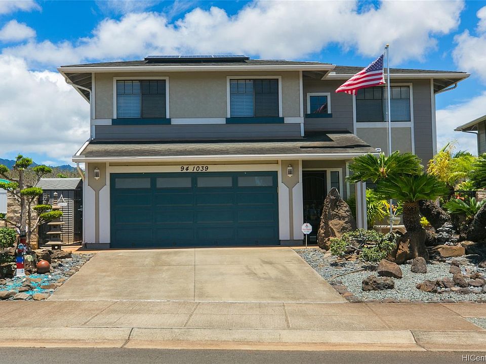A RARE FIND. Two story 4 bd /3 ba single family home w/2261 sq. ft. of living space, w/ to include a 2 car garage complete a screen roll down door, located in a quiet neighborhood in Royal Kunia. This perimeter lot property is located on quiet cul-de-sac and is professionally landscaped with timed sprinklers and a waterfall flowing into the swimming pool. Newly installed vinyl plank flooring, 28 leased solar panels w/ net metering agreement, 3 split air conditioners, motioned detection system and custom windows and sliding door to a covered lanai adjacent to the pool. Minutes away from shops restaurants, schools, recreation center, and freeway access. Monthly association fee of $49. A MUST SEE!