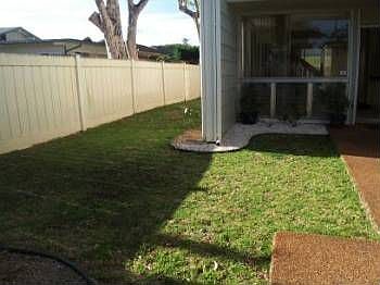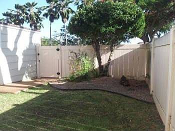 Conveniently situated in Mililani in the Noholoa Hale. Rarely available corner lot greets you with a nicely landscaped courtyard with long side yard that opens up to a large backyard. Beautifully appointed corner unit townhouse that has added storage space and yard area giving it that special feeling and privacy of a single family home without all the high maintenance! Recently renovated with new kitchen cabinets and countertops, with new refrigerator and glass cook top stove & oven including a large stack washer/dryer. Entire unit has just been freshly painted, with new carpet downstairs in the large living room located off the dning area and kitchen. There is a half bath downstairs and 2 full baths, including the master bathroom upstairs that have new bath tubs that have just been refinished and like new. All 3 bedrooms have beautiful views of the trees adding a very tranquil and peaceful feeling. Over 1324 interior sq. ft. with very high ceilings giving that even more spacious feeling and allowing our tropical tradewinds a fantastic cross ventilation and making it a very cool and breezy home. The master bedroom has its' own private deck and bath including a large walk-in closet. Another large walk-in clost in the hallway for that added strorage for linens and towels. All this embraced with a fenced in back yard with over 1,136 sq ft. It truly feels like a Single Family Home and awaits that special family to enjoy. Awesome neighborhood and just minutes to schools, shopping, dining, recreation facilities, parks, and even a few military bases. Won't last long ~ currently accepting applications and yes, we are pet-friendly!