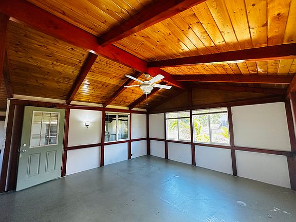 Well-built cozy cabin on a lush property in Green Sands! Open living space with pine tongue and groove ceilings. Easy access to the main road, as this home sits just two lots in on Mauka St. Plenty of green grass (fairy grass has been planted to replace guinea grass) and vegetation with a few coconut trees for shade.