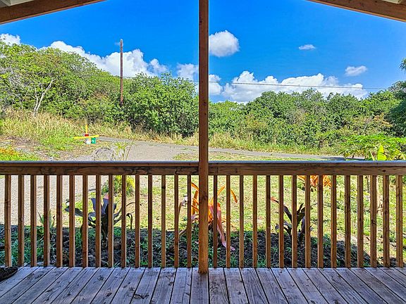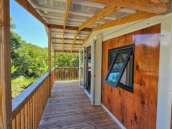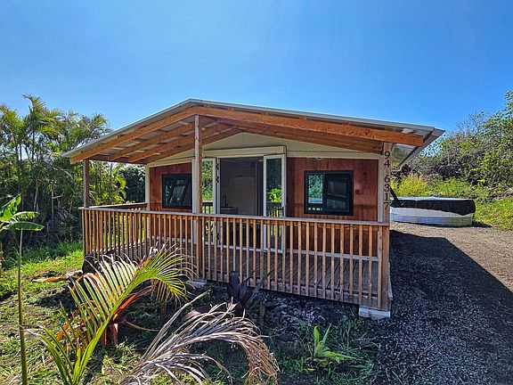 New 2 bedroom, 1 bathroom, prefab off grid home in beautiful Green Sand subdivision. Enter this house through the front covered lanai and into the open concept living room, dining and kitchen area. The kitchen has plenty of cabinets with soft closed drawers, stone countertops, and upper wall cabinets for additional storage. Appliances include a refrigerator and propane cooktop. One full bathroom has a large walk-in shower with heavy duty glass shower doors, a 48 V solar system with 6 460 W panels with lithium battery and a 3200 gallon water tank with cover support. Perfect setup for sustainable off grid living! Home has high speed WiFi and security cameras. This property is nicely landscaped including several papaya trees and banana trees.