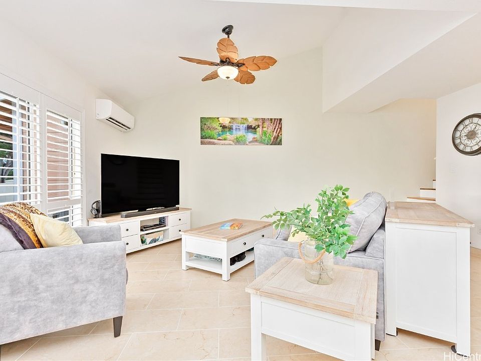 Absolutely stunning 3-bedroom, 2.5 bath townhome in the centrally located in neighborhood of Waikele, featuring a private, fenced yard with professional landscaping and a tranquil golf course view. Step inside and be greeted by a light-filled & spacious living space that invites relaxation and comfort. The open floor plan seamlessly connects the living room, dining area, and kitchen, creating an ideal setting for both entertaining and everyday living. Beautifully upgraded premium home with 2 car garage, additional 2 driveway parking, and Guest parking throughout. Brand new LVP flooring, water filter system, and microware along with stylish stairway LED chandelier etc. offer everything you are looking for in your future home. Located near Waikele Shopping Center, lots of dining options, Waikele Premium Outlet Mall, Waikele Golf Course and more! Rarely available unit in Village on the Greens!