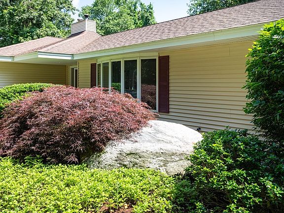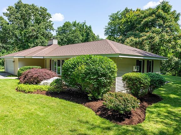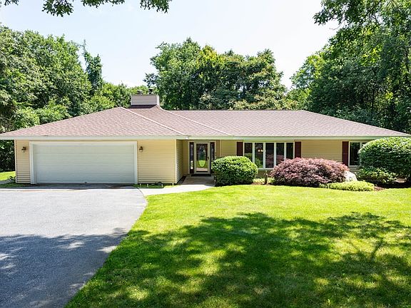 This custom-built full basement ranch, situated on almost 2 acres of land offers plenty of privacy. The home is set on a well landscaped corner lot abutting a small neighborhood with a cul-de-sac. The kitchen is filled with stainless steel appliances and the family room/living room are off to the side. Both the kitchen and family room have cathedral ceilings, skylights, ceiling fans, and recessed lighting. The dining room is entertainment size with a large bay window overlooking a manicured garden. There are two main bedrooms with full bathrooms and built-in wall air conditioners. With several exterior accesses, you will enjoy spending plenty of time out on the large brick patio. The newly installed Generac generator is fully automatic so you're never without electricity. The laundry is on the main level. There are expansion possibilities with a full unfinished walk-out lower level plus there are two oil tanks and several built-in shelves for storage. Easy highway access.