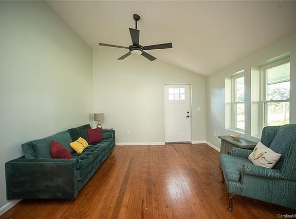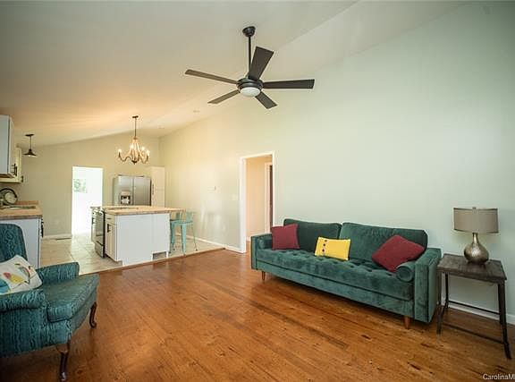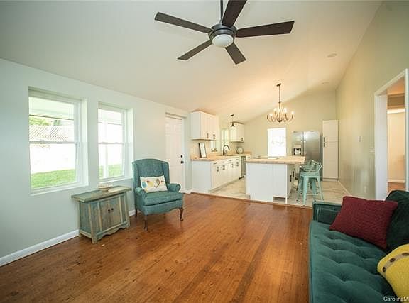 Back on the market! Almost new-new roof, new heat pump, new siding, new kitchen, new bathrooms. Not new are the original hardwood floors that were underneath many many layers of vinyl flooring. Luckily these floors give this home a cozy cottage feel. Giant butcher block kitchen island, great for cooking and entertaining your guests in this open kitchen-Livingroom with vaulted ceilings. Kitchen has lots of cabinet space. New deck with a lovely mountain view. Rocking chair covered porch, for Sunday sipping. Unfinished basement provides great storage, could be workshop space/ artist studio.