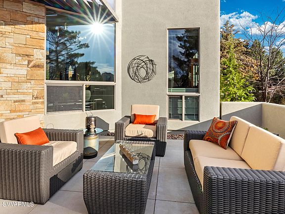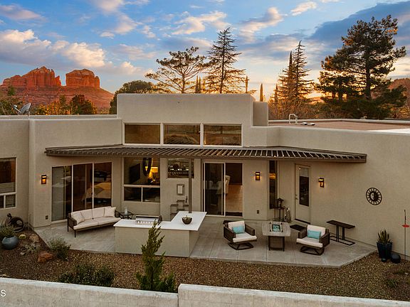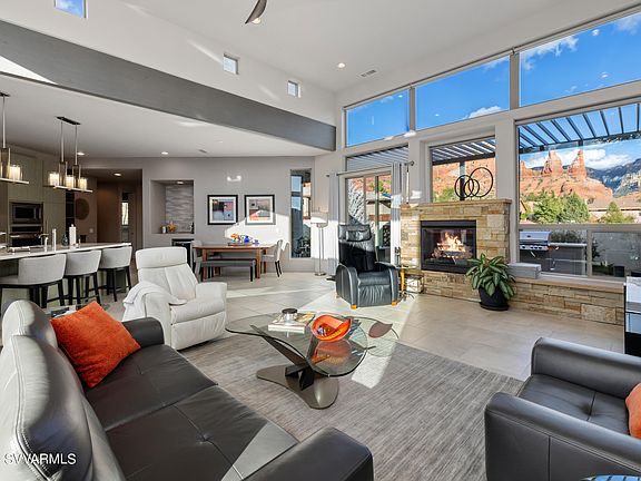 Magnificent Panoramic views from soaring 14 ft. high windows take your breath away the minute you step inside this luxury custom home. Sweeping Mountain Views of the Iconic Twin Buttes, The Sisters, The Chapel all the way to Courthouse Butte. The open Contemporary floor plan, all on one level, boasts custom cabinetry and designer features throughout. Stunning Modern kitchen featuring custom cabinetry, elegant quartz countertops complimented by a beautiful tile backsplash and spacious island. One of the nicest Primary suites you will find including a large sitting and dressing area, designer closets, and separate tub/shower. Start your day on the front patio facing Cathedral Rock, sipping morning coffee as you watch the sunrise. In the evenings, retreat to the back patio and enjoy a glass of wine while entertaining friends with the built-in BBQ during the "golden hour," when the red rocks burst into brilliant colors listening to your soothing water feature. Fresh exterior paint in 2024 gives this home great curb appeal. A dual-zone HVAC/heating system offers both cost-effectiveness and energy efficiency. Near numerous hiking trails! This home shows like a dream. Short term rentals are allowed. Buyer to verify. Call today! This one won't last long!