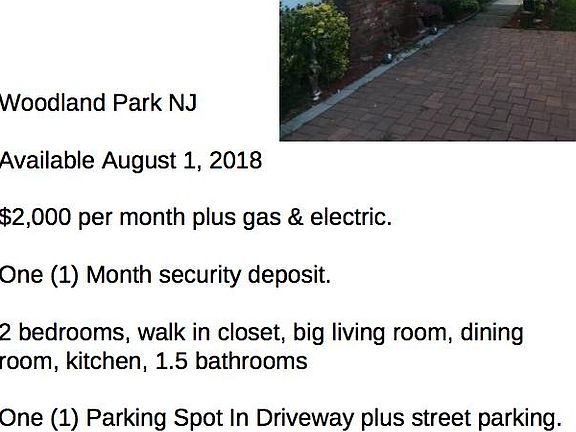 Woodland Park NJ Available August 1, 2018 $2,000 per month plus gas & electric. One (1) Month security deposit. NO PETS 2 bedrooms, walk in closet, big living room, dining room, kitchen, 1.5 bathrooms. Best suited for 3 people living in the house. One (1) Parking Spot In Driveway plus street parking. Includes water, refrigerator, dish washer, kitchen table, washer, dryer, windows a/c's. References and income verification may be required.