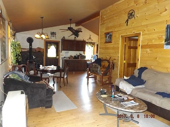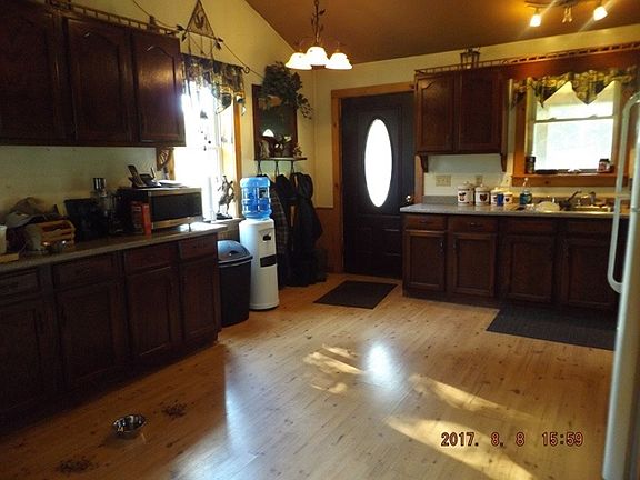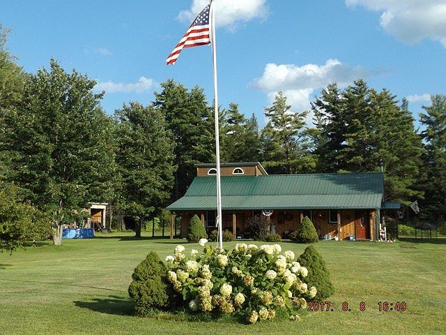 Looking for out of town with 4 bedrooms & 2 baths here it is, located back off the road with plenty of yard to play in! Well maintained and ready to move in, there are 3 bedrooms on the main floor along with a full bath with washer & dryer hook-ups. One bedroom and bath upstairs loft style with a deck off the bedroom. L shaped living room-dining room-kitchen offering a wide open floor plan & easy to heat per the seller. Heated with a wood stove using 8-10 cord of wood a year, if you want it a little warmer there is a kerosene monitor heater you can just turn on. Plenty of natural wood thru out this home. No need for a basement here there are multiple out buildings to store all your extra stuff, toys & farms equipment if you have it. One building 12 x 16 is equipped with heat as well as elect & can be used for a man/women cave or work shop. Another outbuilding 14 x 24 has a horse stall in it plus room for storage in the front. On the opposite side of the yard you will find a 4-5 stall pole barn with plenty of room. An additional smaller shed is located near the back of the lot. There is one shed currently up near the garden & pool area where the lawn mower is and this one is neg. Plenty of trees, white oak, apple, crab apple, blue spruce & all this is surrounded on the right side and back by 864 acres of state forest land. Taxes do not reflect any exemptions. A new chimney for the wood stove was added two years ago. There is enough wood cut for the next 2-3 years and this is also negotiable. The large covered front porch area is a great place to sit and relax, watch the birds & wildlife, read a book or just reflect on your day! A small fenced in area for the pets or small children is located thru the French style doors in the living room. There is an additional lot .46 acre next door that may be able to be purchased as well as 1.6 acres directly across the road, this land is all wooded, while the lot adjoining next door has been cleared and has water available at the road. This home is the last one on the road offering public water, although the current home owners use the well. Cable available and elect runs around 90 to 100 a month per homeowner. Property lines on the left side and out back is the state forest markers, on the right the first tree behind the shed.