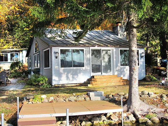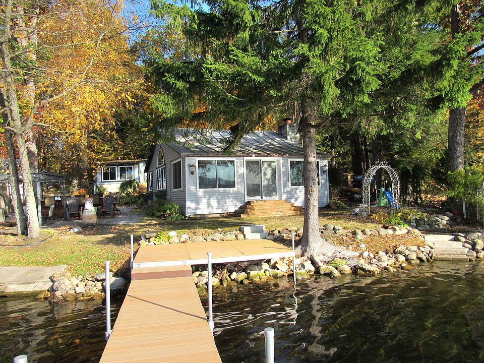 This adorable house at the shore of Glen Lake has been totally remodeled and offers a gorgeous kitchen with granite counters and stainless steel appliances. Every room offers up close and gorgeous lake views. A delightful patio with summer kitchen provides a perfect lakeside dining situation. The master bedroom overlooks the lake with expansive windows with a laundry area just off the kitchen. The entertaining capacity could be expanded by finishing a portion of the garage. The property goes out to Hall Rd and includes the grey storage shed, look for survey markers
