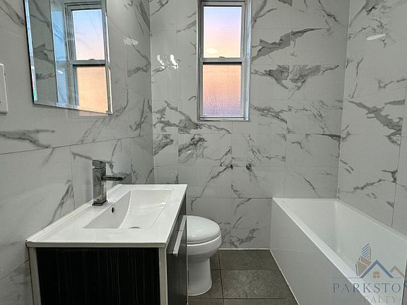 Beautifully renovated 2BR apartment featuring a white modern kitchen with stainless steel appliances (dishwasher & microwave), hardwood floors, and a contemporary tiled bathroom.