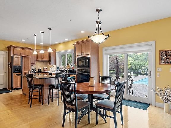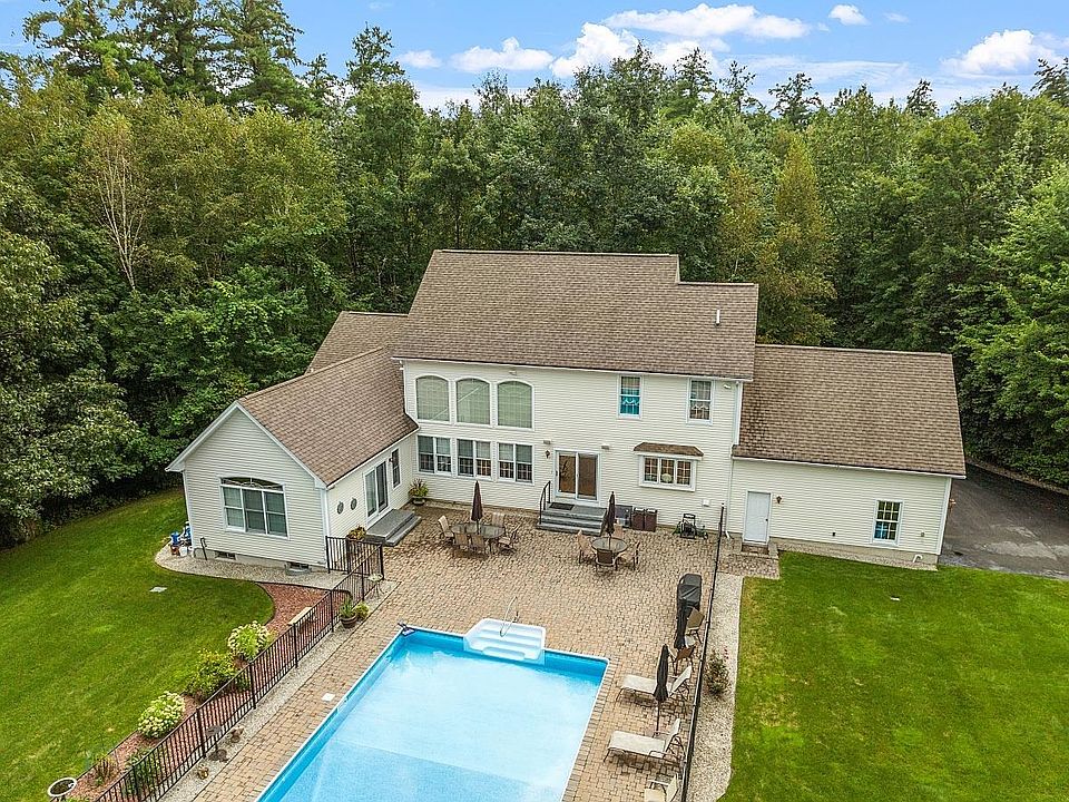 Stunning contemporary colonial situated on beautiful private 3.8 acre lot. The open concept floor plan features a fully applianced kitchen with granite counters, cabinets galore, center island and dining area. The kitchen flows into the sun filled living room with soaring ceilings and dramatic gas fireplace with stone surround. The living room has vaulted ceilings and recessed lighting. Formal dining room with crown moulding. Two story foyer. The spacious first floor primary bedroom has recessed lighting, walk-in closet and overlooks the patio and inground pool. The primary bathroom has walk-in tiled shower, jetted tub and double sinks. The first floor is completed by the half bath with laundry. The second floor has a sitting area that overlooks the family room. There are two additional bedrooms and a full bathroom on the second floor. The unfinished lower level has tons of space for future expansion. Central air conditioning, stand-by generator and irrigation system. Enjoy the beautiful stone patio and heated in-ground pool. Great property for entertaining or just relaxing at home. Two car attached garage. Amazing landscaping and yard. Great location! Showings begin at the open house on Saturday, September 2, 2023 from 11-1.
