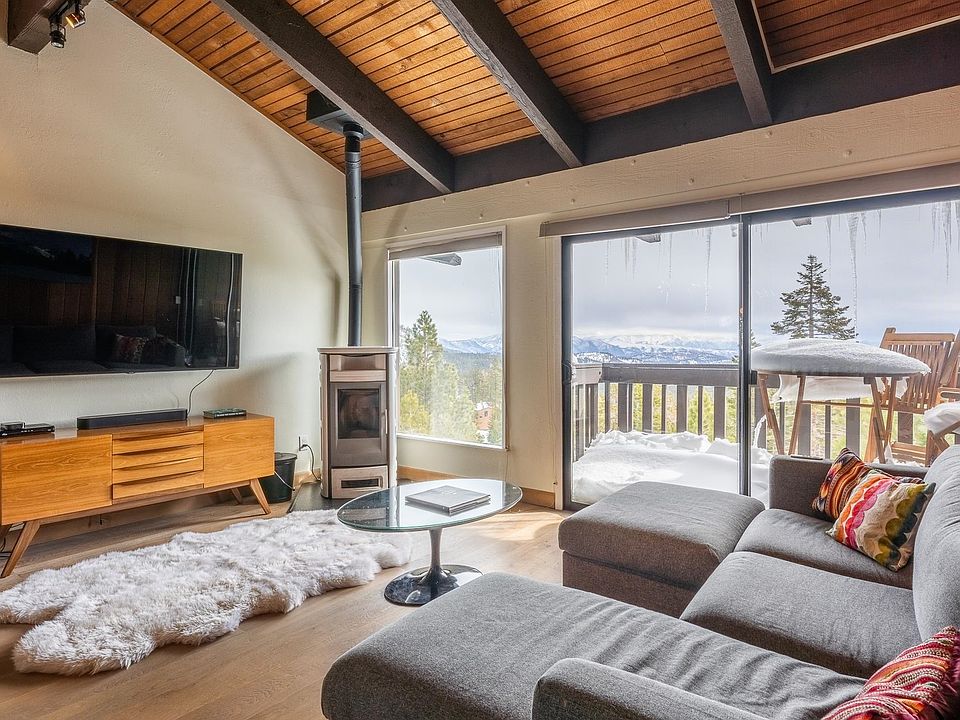 The perfect antidote to the city. Mammoth Point #109 is a modern, completely remodeled 2-bedroom 2-bathroom townhome with incredible views of multiple mountain ranges, Crowley Lake and beyond. The east-facing wall's double glass doors and a large window showcase the constantly changing Sierra skies. Located a short distance from Canyon Lodge it is, at times, “walk to the slopes, ski home.” The home is a coveted split-level end unit with one shared wall and an extra window. The open plan upstairs features the den, dining room and kitchen. The views are exceptional throughout. The chef-friendly kitchen features marble counters and a gas stove. There are new wood floors in the upstairs areas. A comfy sectional couch is located by the windows and faces a large flat screen TV. An Italian pellet stove efficiently heats both the upstairs and the bedrooms. There's also a balcony…with a ridiculous view. Downstairs is the master bedroom with ensuite bathroom and a guest bedroom and bathroom. Each bedroom has a queen-size bed and cozy woven wool carpet. The bathrooms have heated floors. At night, in the master bedroom, you can gaze at stars and satellites from the comfort of your bed. Amenities at Mammoth Point include a hot tub, sauna and laundry facilities, although a washer and dryer are also in the unit. The location of the complex makes this townhome very close to Canyon Lodge, the Lakes Basin and Tamarack Lodge.