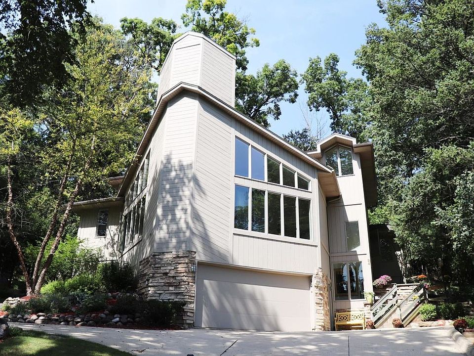 A Beautiful Modern Lake Home in Loch Vista Club on GENEVA LAKE. This open concept home has three floors opens with an entrance way leading to the grand room with 18' ceiling and windows throughout. A home that lets in the natural light, surrounding green and seasonal peeks of the lake. Spacious 4 bedrooms, 3.5 baths, lower entertaining room, large master bath, walk in closet and many recent upgrades throughout! This is an artistic and clean angled home built into a hill gives vertical views throughout the home. The almost 3,200 sq ft of layered artistically designed living space gives ample room to host ambitions for any lifestyle. Association has a lakefront park, large pier with 13 boat slips and a second pier for swimming and kayaks! Nearby boat moorings are available.