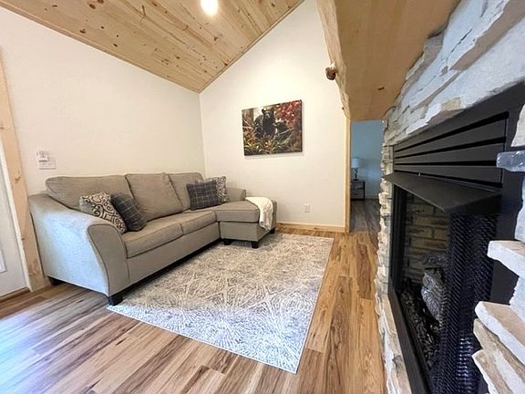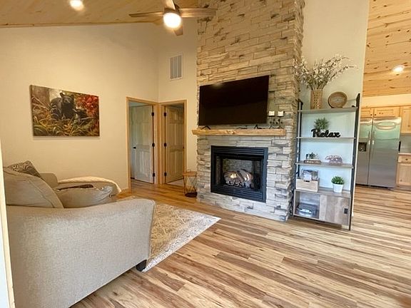 Brand new, 2 bedroom 2 bath, private cabin in the mountains of Western North Carolina! Open living/dining/kitchen area with beautiful stone, gas log, fireplace in the living area. Cathedral tongue and groove wood ceilings in the open living area and master bedroom. Solid wood, custom, shaker style, soft close cabinets, with quartz counter tops. Stainless steel kitchen appliances. Washer/Dryer/Pantry area in kitchen. Luxury Vinyl Plank flooring throughout with ceramic tile flooring in bathrooms. Full length covered porch with tongue and groove ceiling, for comfortable outdoor living, accessed from the living and master bedroom areas. Wood siding with metal roof.