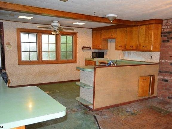 Three private acres of tranquility set up Mountainside across from the Musconetcong River. Home needs updating/work but the potential is grand. Renovate this vintage home and customize to your liking. Open Kitchen/DR layout, wood burning brick fireplace w mantel in LR. 2 BRs on one side and 2 BRs on opposite end, great for privacy. Separate laundry room on 1st floor. 2nd entry area has plenty of room to be converted into a mudroom. Unfinished basement has bilco doors to outside and can be finished or used for storage and includes a toilet and sink and a separate workshop area. Garage has workbench area and built in shelving for storage. This property has surround views of wooded bliss. Property sold AS IS, all inspections & CO responsibility of buyer