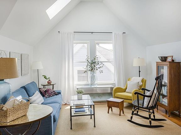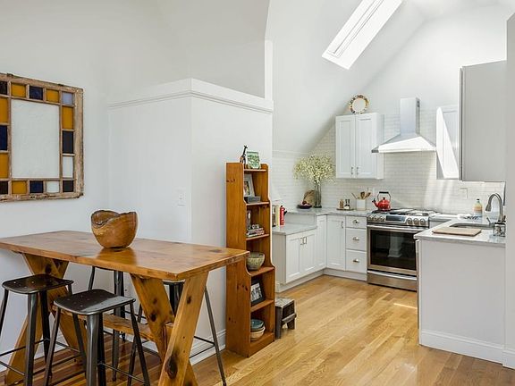 Perched in the treetops just 1.5 blocks from the soon-to-open Magoun Square T Station (2021 completion), this dramatic penthouse condo was fully renovated in 2016. The harmonious fusion of cathedral ceilings, well-proportioned rooms and skylights throughout distinguish this spectacular loft-like home. The flexible and open floor plan has bedrooms at either end, offering separation and privacy. Upon entry, the soaring ceilings and skylights highlight the airy and bright living room, equally suited to gracious entertaining and solo unwinding. Lofted storage area is accessed by a vintage reclaimed ship ladder. The kitchen is a bright and sunny delight, featuring Carrara marble countertops, subway tile backsplash, white cabinets and stainless steel appliances with gas range. The bathroom offers contemporary elegance with a deep soaking tub and subway tile surround. In-unit laundry, private basement storage and common grilling area. The rear deck is a sunny and private oasis in the city!