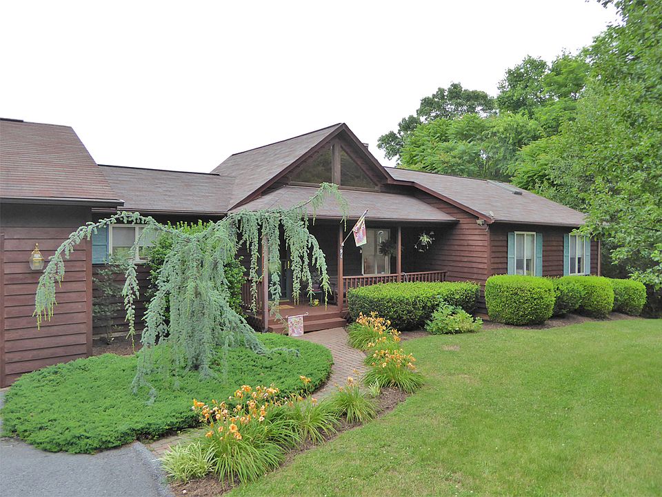 Immaculately maintained home, looks like a rancher from the front, but it's a gorgeous chalet with all-glass prow and tongue and groove cathedral ceiling! Hardwood floors in main living area, two gas log fires, spacious kitchen-diner and small island/breakfast bar. Beautiful professional landscaping, large deck wrapped around the prow, views! Large attached 2 car garage. No HOA! Don't miss this one!