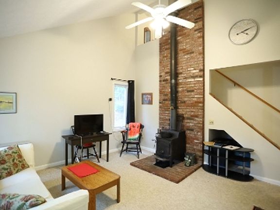 Tucked away in a wooded setting, this furnished home features a cathedral ceiling, wood stove fireplace, and open-concept living area.