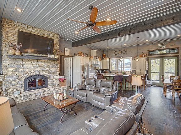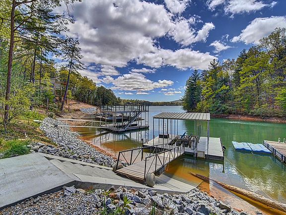 Amazing Year Round LAKE BLUE RIDGE Views with long range mountain layers in the background! Great location off Eaton Rd & within 5 mi of Downtown Blue Ridge! This lakefront property offers so much...4 garage spaces w 12' ceilings great for storing all your toys & 2 addt'l carports that are tall enough to allow RV storage (50 amp hookup w sewage dump), builder's home so you'll be getting all the extras...great room w tall ceilings offers a gourmet kitchen w leathered granite countertops, dining area, gorgeous wood burning fireplace, custom stair railings, hardwood flooring throughout, split floor plan w large MBR & MBA featuring jetted tub, separate tile shower, oversized deck w hot tub open to the phenomenal view! Pavilion w wood burning fireplace is ideal for entertaining! Bar area close to lake complete w tanning deck! Dock included w boat lift!