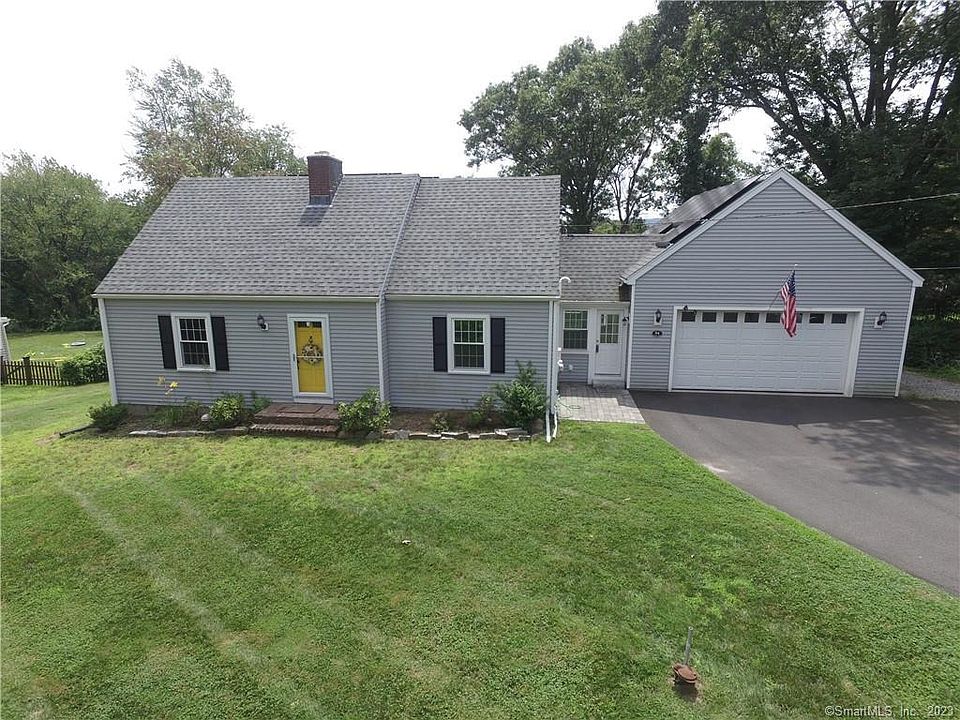 charming cape in South Glastonbury- updated eat in kitchen with newer stainless steel appliances and stone countertops- hardwood flooring- family room with wood burning fireplace- mini split system heat and ac- newer windows and vinyl siding and driveway- this home has 2 bedrooms on the second floor each with built ins and lots of storage- full updated bathroom is in the middle of the 2 bedrooms-first floor master bedroom with bay window and new built in closet and access to full bathroom - unfinished full walk out lower level- outside shower is fun in the summer- 2 car attached garage with full floored loft above- excellent for additional storage- tile breezeway connects garage into kitchen-Solar Panels have been an excellent addition for reduced electric bills and is transferable to the new owners- private level backyard