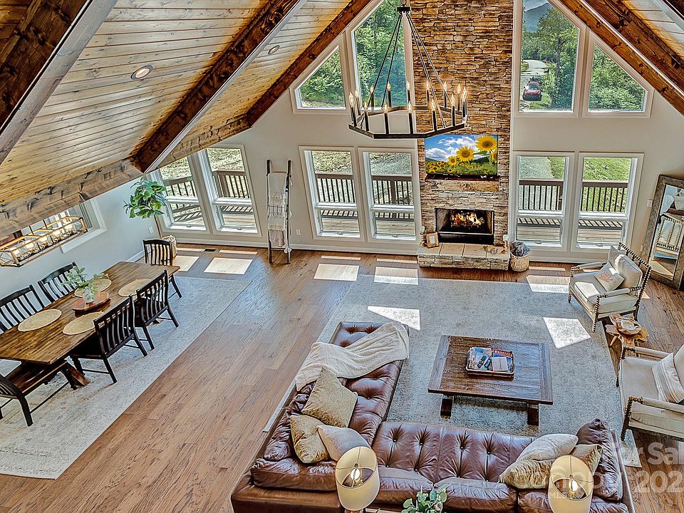 Perched at a almost 5,000 feet elevation with long-range views, this ultimate mountain getaway offers some amazing views. Whether you're dreaming of a serene full-time home or a high-performing vacation rental (grossing over $116K in 2024), this fully furnished luxury retreat checks all the boxes. Step into a spacious open floor plan where soaring tongue-and-groove cathedral ceilings and a warm stone fireplace set the tone for mountain comfort. Expansive windows flood the home with natural light and frame breathtaking southern views from nearly every room. The chef’s kitchen is designed for gathering, featuring a farmhouse sink, center island, generous prep space, and a sunny breakfast nook and dining area. Just beyond, sliding doors lead to a partially covered wraparound deck with a porch swing overlooking Sugar Mountain’s slopes, plus a firepit table for unforgettable evenings under the stars. The main-level primary suite includes deck access, a spa-inspired bath with soaking tub, double vanities, and a huge walk-in closet. Another bedroom, full bath, and laundry room complete the main level. Upstairs offers a flexible loft for a yoga space, reading nook, or home office—plus a bedroom, bonus room currently used as an additional bedroom and a full bath. The lower level is made for fun, with a second living room, fireplace, bar area, game space, bunk room, and access to a bubbling hot tub. Outside, enjoy a grassy yard for cornhole or future fire pit, plus an attached two-car garage in the lower level. The carport on the main level allows easy unloading of groceries and luggage. Having a newer home built in 2021 takes away so many concerns! Just 3 miles from Beech Mountain Resort and 4 miles from downtown Banner Elk’s shops and restaurants, in a small, gated community. This home is ready for your mountain lifestyle—whether you're soaking in the views, hitting the slopes, or hosting weekend getaways.