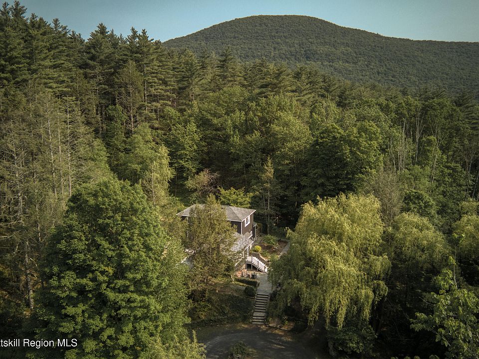Nestled among towering pines and the soothing sounds of a nearby stream, this beautifully renovated country retreat offers the perfect blend of rustic charm and modern comfort just minutes from Woodstock. The spacious home features a dramatic living room with vaulted ceilings, exposed beams, and a striking stone fireplace, an updated kitchen with a sunny breakfast nook, two main-level bedrooms with a full bath, and an upstairs master suite with lofty ceilings, full bath, additional bedroom, and cozy lounge. Outdoors, meandering stone paths, natural landscaping, and a spacious fenced backyard create an idyllic setting for dining al fresco, gathering by the fire pit, or simply relaxing in nature. A versatile 960 sq ft three-car garage with upgraded electric and workshop space offers endless creative potential. Surrounded by natural beauty yet close to shopping, theaters, and Catskills adventures, this enchanting property is a true country sanctuary.
